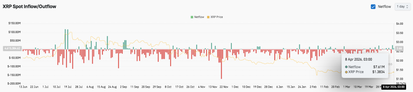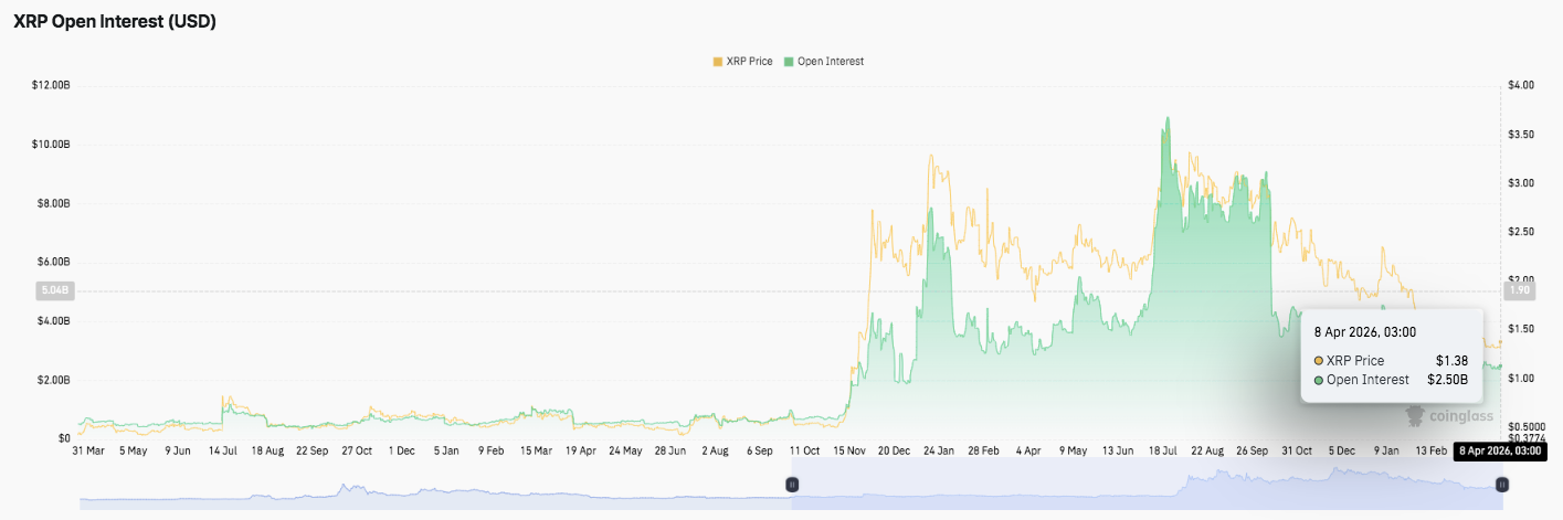 Open interest data shows a rising trend, reaching approximately $2.5 billion during early April 2026. This increase aligned with XRP’s move toward $1.38, which suggests growing market participation. However, recent declines in open interest indicate reduced trader activity and potential uncertainty.