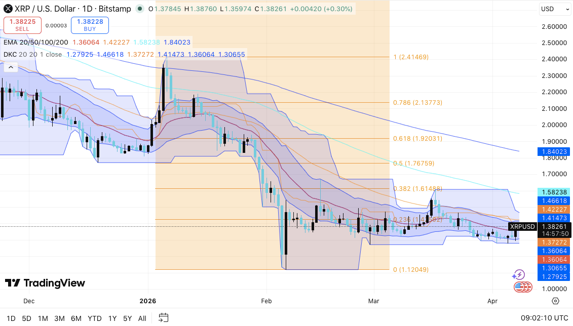 XRP continues to trade within a tight range after a prolonged decline that began in late 2025. The market now shows a clear consolidation phase, with price holding near $1.38 while traders monitor key support and resistance levels.