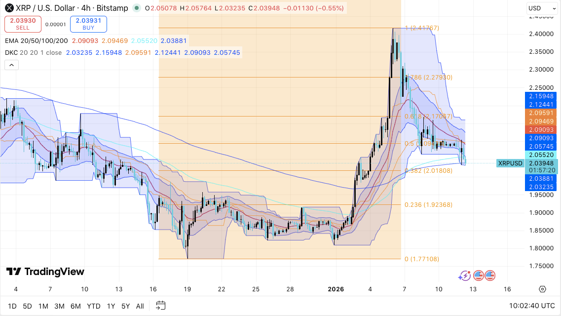 XRP continued to trade in a consolidation phase after a strong late-year rally, with price stabilizing near the $2.04 area on the 4-hour Bitstamp chart. The market appeared to pause rather than reverse, as traders assessed prior gains and adjusted leverage exposure.