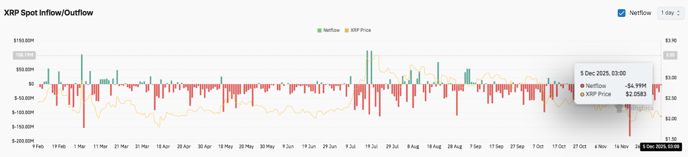 Brief inflow spikes appeared in March and July but faded quickly. By December 5, XRP recorded a $5 million outflow while trading near $2.06. Moreover, this trend highlights cautious sentiment that persists even during price rebounds.