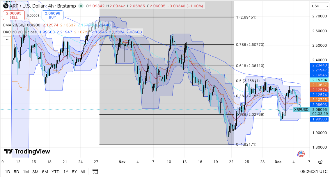 XRP has struggled to break above the $2.15–$2.16 zone, which aligns with the 4H EMA ribbon and the 38.2% Fibonacci retracement. Buyers attempted several recoveries; however, each push met renewed selling pressure.