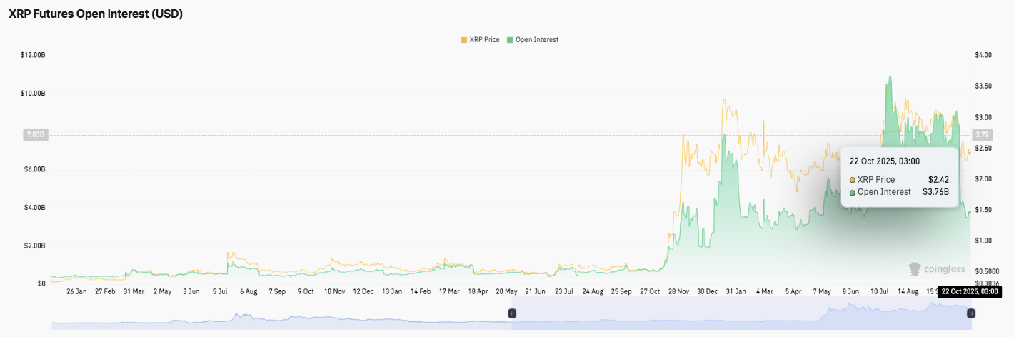 The most recent data shows open interest at $3.76 billion, with prices near $2.42. This indicates ongoing participation even amid declining prices. The strong correlation between rising open interest and price volatility highlights increased speculative positioning within the derivatives market.