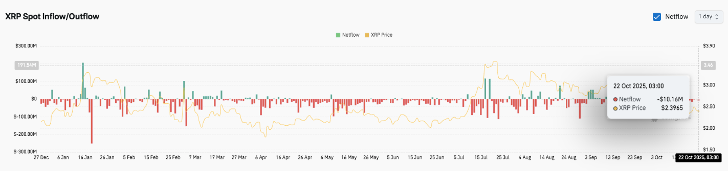 Spot netflows continue to show dominant outflows through most of 2025. The latest data recorded a $10.16 million outflow on October 22, signaling consistent profit-taking. Although brief inflows occurred midyear, overall capital movement remains negative, implying reduced accumulation and muted upward pressure.