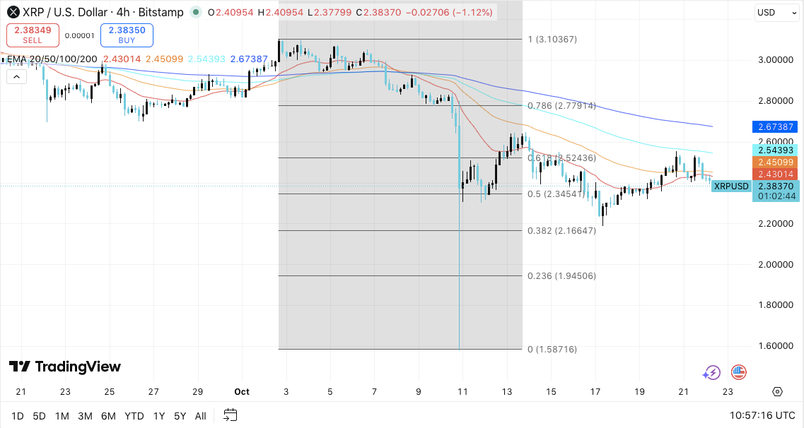 The XRP/USD 4-hour chart shows that price action has been consolidating between $2.34 and $2.54 for several days. The 50-EMA, currently near $2.43, acts as immediate resistance, while the 100-EMA and 200-EMA at $2.45 and $2.67 respectively form stronger barriers above.