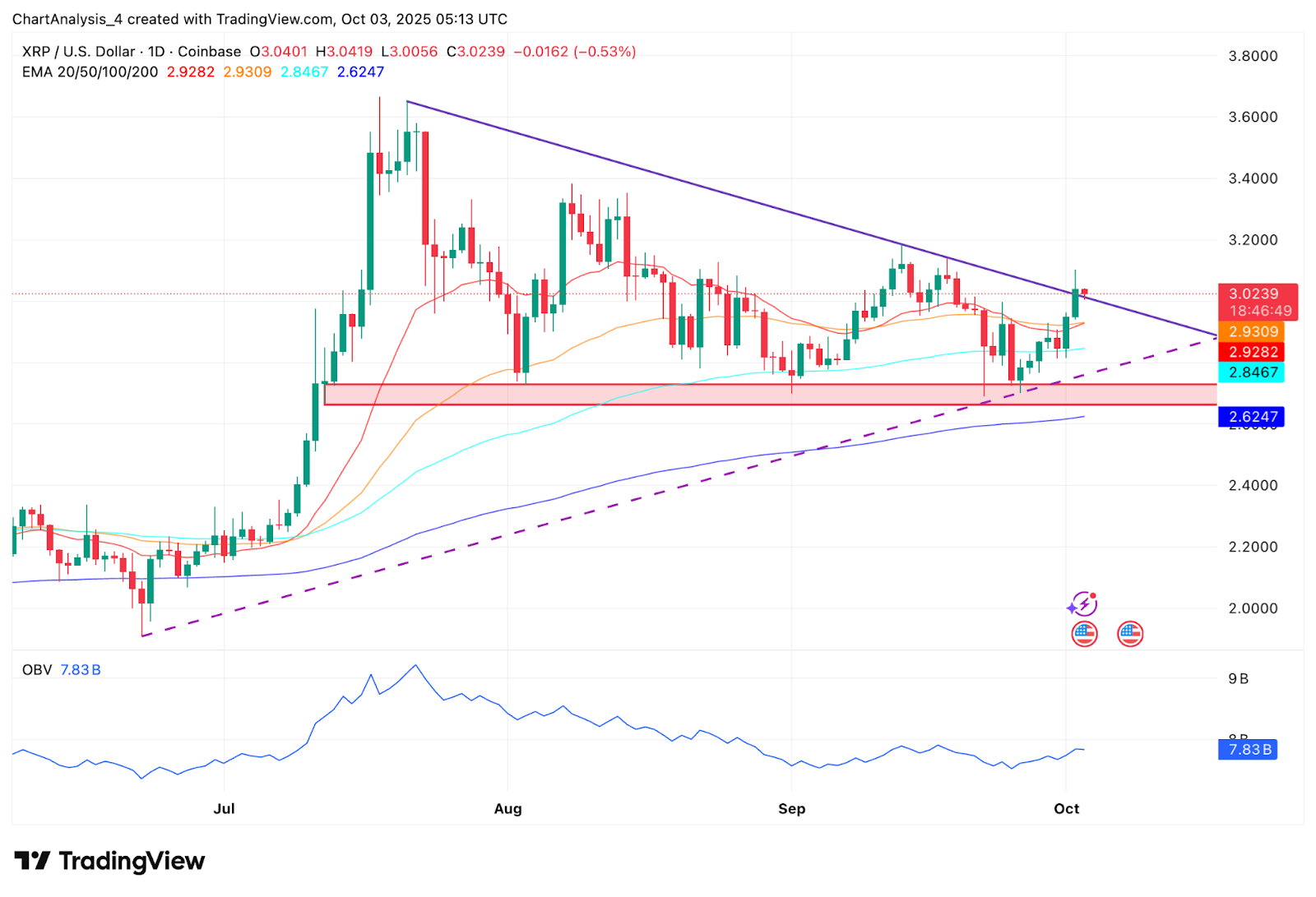 XRP price today is trading at $3.02, facing resistance near $3.04 after testing the upper boundary of its descending triangle. The token has reclaimed the 20-day EMA at $2.92, while holding above the 50-day EMA at $2.93. Traders are watching whether XRP can break through $3.20 or risk slipping back toward its support base.