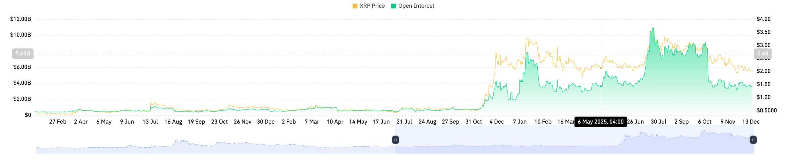 Significantly, XRP futures open interest has expanded sharply over the past year. Data shows open interest rising from under $500 million in mid-2024 to $3.72 billion by December 15, 2025. This expansion reflects rising trader participation and speculative exposure.