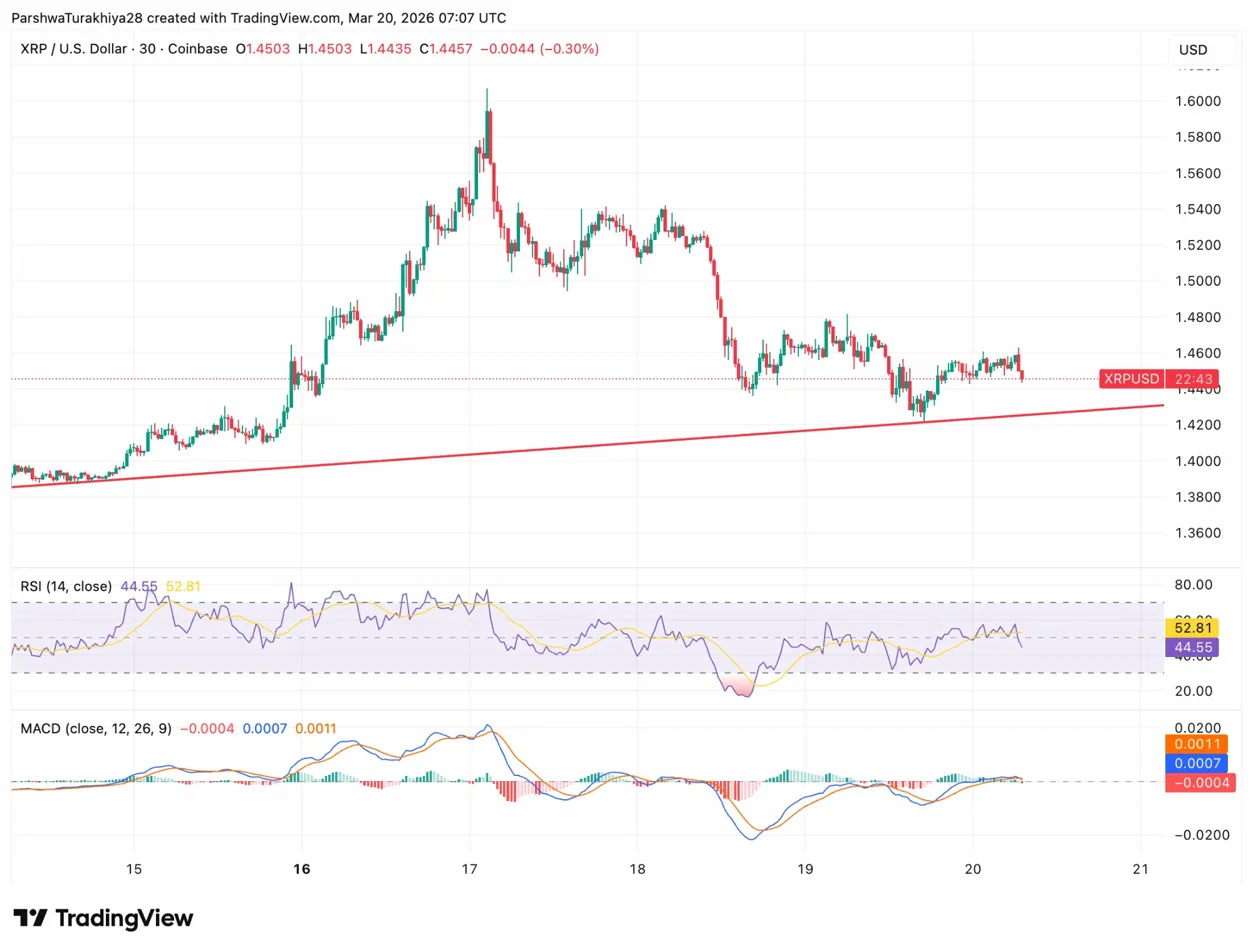 XRP trades at $1.4454, down 0.16%, sitting just above the ascending trendline on the 30-minute chart that has held since the March 19 lows near $1.42.