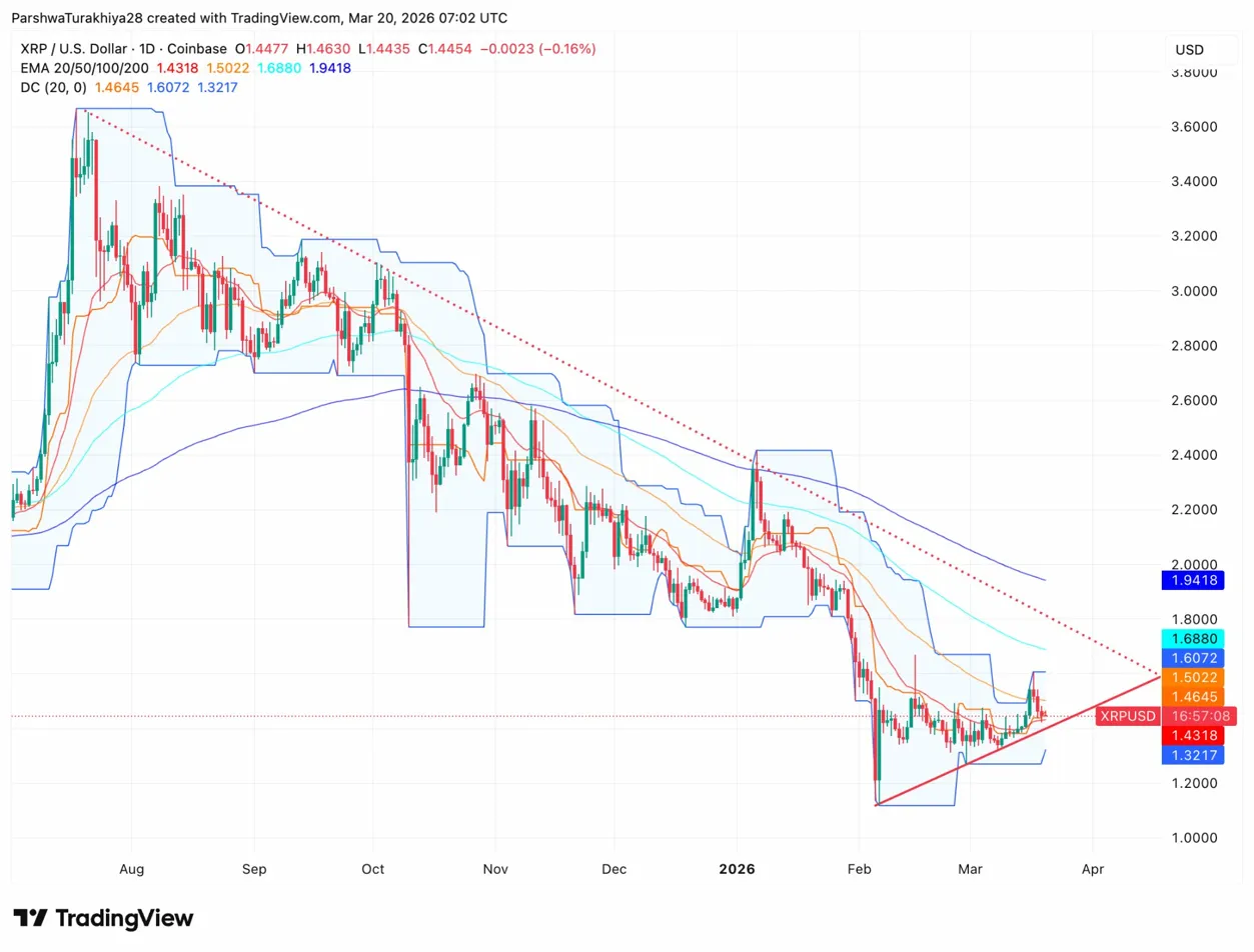 - Bullish case: XRP holds the ascending trendline above $1.43, MACD crosses bullish on the 30-minute chart, and price reclaims the Donchian midline at $1.4645. The March 27 options expiry at $1.40 expiring worthless for put holders would remove a potential source of selling pressure, clearing the path toward the 50-day EMA at $1.5022 and the Donchian upper band at $1.6072.