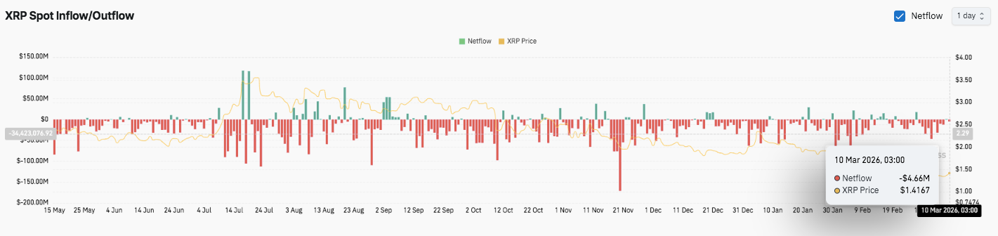Spot market flows show a similar pattern. Exchange data reveals persistent outflows across several months. Red bars frequently dominate the chart, which signals continuous selling pressure.