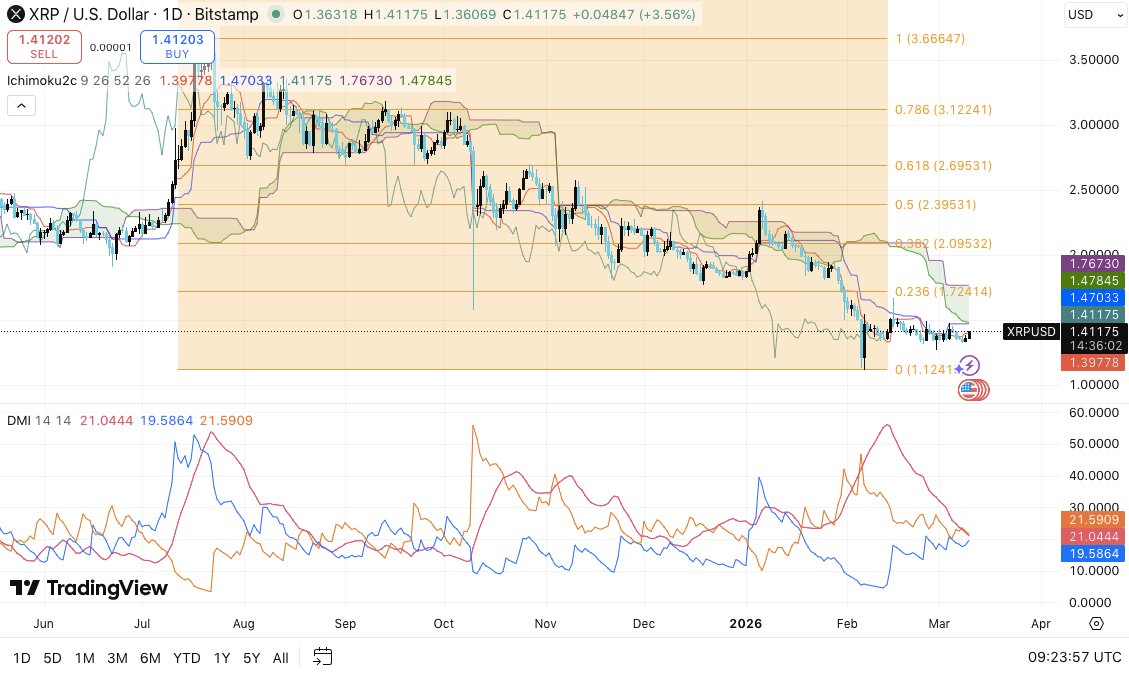 Downside levels: Immediate support sits around $1.36, followed by the stronger structural level at $1.33. A breakdown below this support zone could expose XRP to the $1.24 Fibonacci support. If bearish momentum accelerates, the market may test the psychological demand area between $1.10 and $1.00.