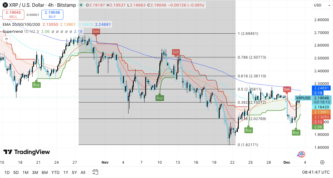 The Supertrend indicator shifted into a Buy phase near that level, which signals renewed interest after the recent correction. Holding the $2.15 support is critical because losing that floor exposes the $2.06–$2.02 demand level again.