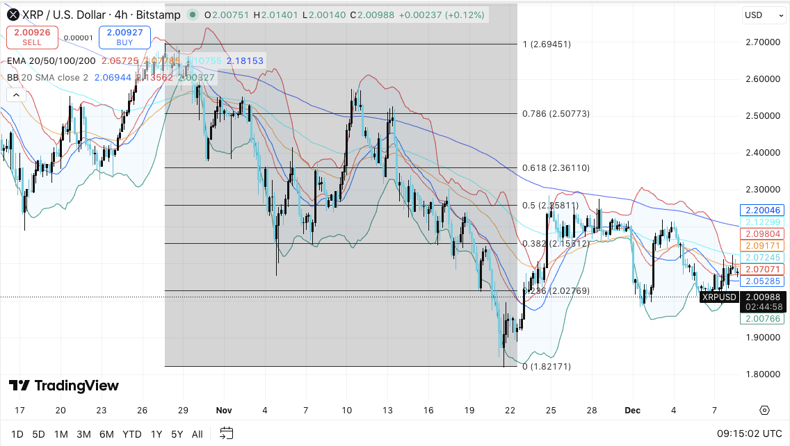 XRP continues to move inside a narrow range as traders watch for signals that could determine its next major direction. The token trades near $2.00, a level that has attracted buying interest several times in recent sessions. Analysts note that XRP remains trapped under a group of key moving averages, which continue to limit upward progress. Besides, volatility has compressed on the four-hour chart, suggesting that a sizeable breakout could develop once momentum returns.
