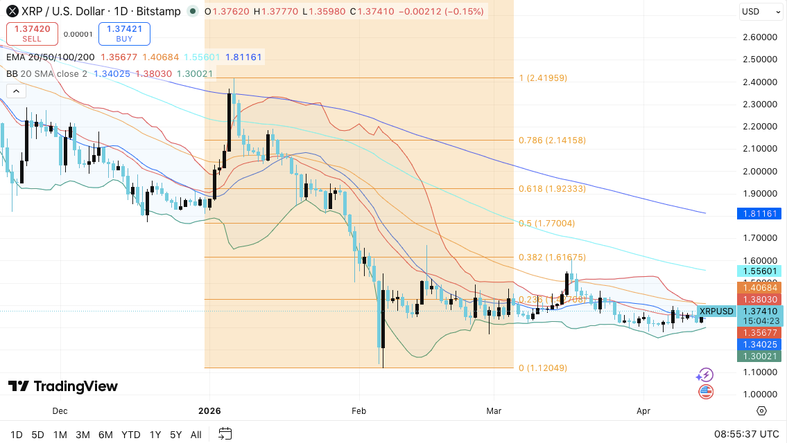 - XRP remains in a downtrend while price compresses between $1.30 and $1.40 range