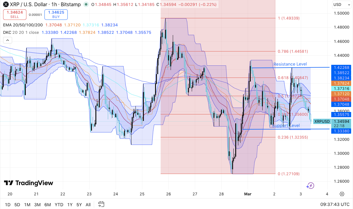 XRP currently changes hands near $1.345 after rebounding from a sharp slide toward $1.27. The broader move reflects a retracement within a prior decline from $1.49. Moreover, price remains trapped between $1.32 support and $1.42 resistance.