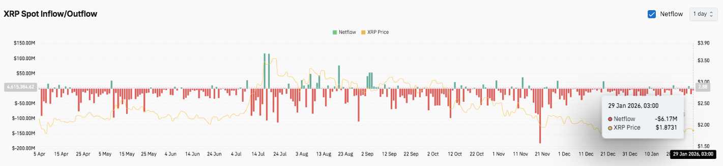 Spot flow data continues to show net outflows dominating activity. Persistent negative flows suggest ongoing distribution pressure. Brief inflow spikes appeared during short-lived rebounds, but they failed to sustain accumulation. Moreover, renewed outflows aligned with XRP’s slide toward the $1.80 region.