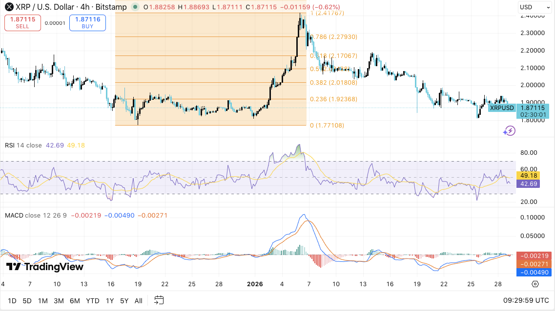 XRP currently holds a compressed range following its recent retracement. Price slipped toward the $1.87–$1.90 zone after rejecting near $2.42. Consequently, the market now trades below mid-range Fibonacci levels, limiting upside follow-through. This behavior suggests cooling momentum rather than a full trend reversal.