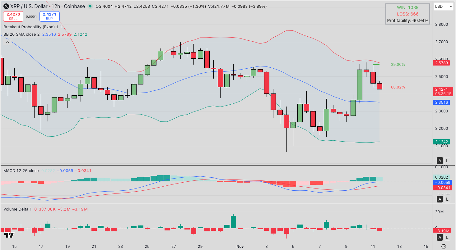 XRP trades near $2.427, hovering between key technical thresholds as market volatility tightens ahead of potential ETF news. On the 12-hour chart, XRP’s Bollinger Bands show the upper band at $2.579, middle band at $2.3516, and lower band at $2.1242, indicating a neutral-to-bullish volatility range.