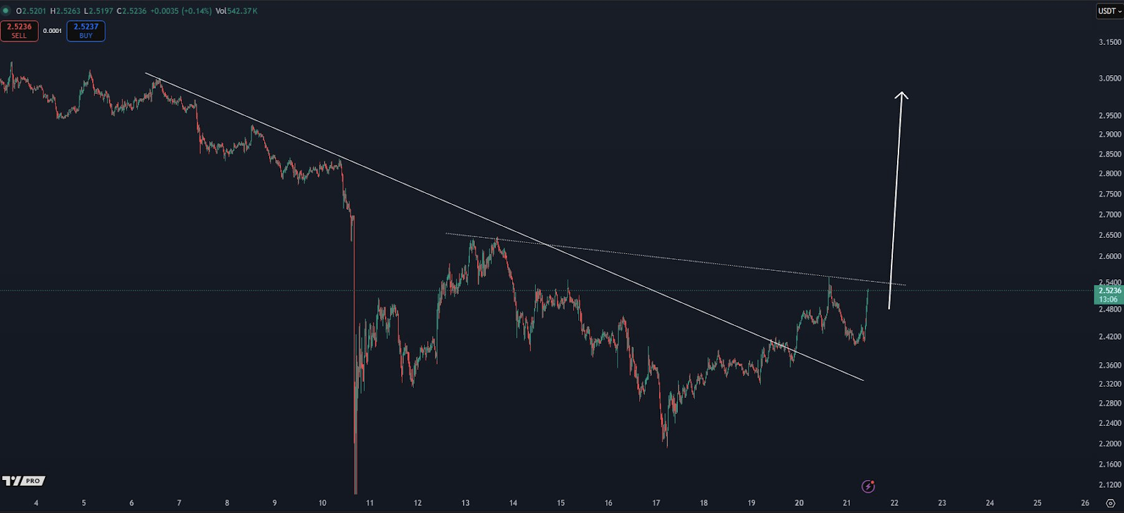 On shorter timeframes, CryptoKaleo added that XRP has confirmed a breakout near $2.48 after multiple failed attempts along the descending trendline. Immediate support now lies around $2.42, while resistance is seen at $2.60. A consistent close above this level could accelerate gains toward $2.85 and $3.00, completing a full reversal structure.