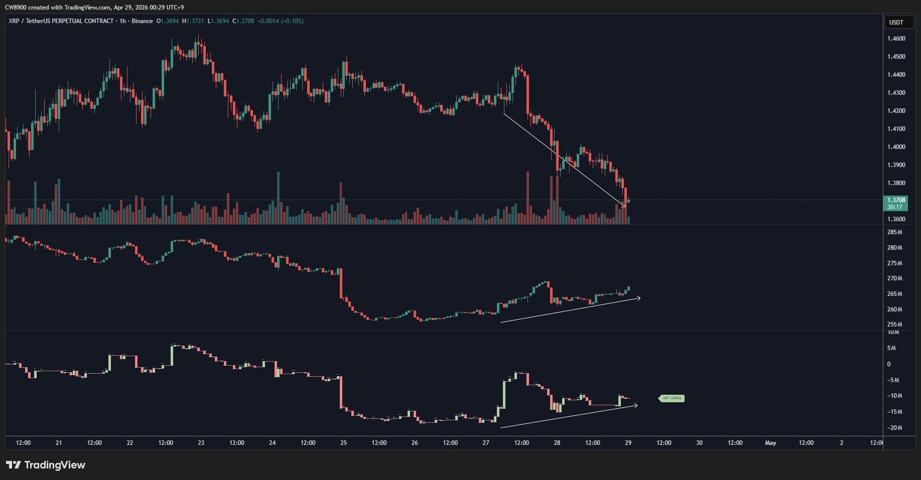 CW8900 presents a contrasting perspective based on derivatives data. Although XRP trades in a clear downtrend, open interest continues to rise. At the same time, net long positioning steadily increases.
