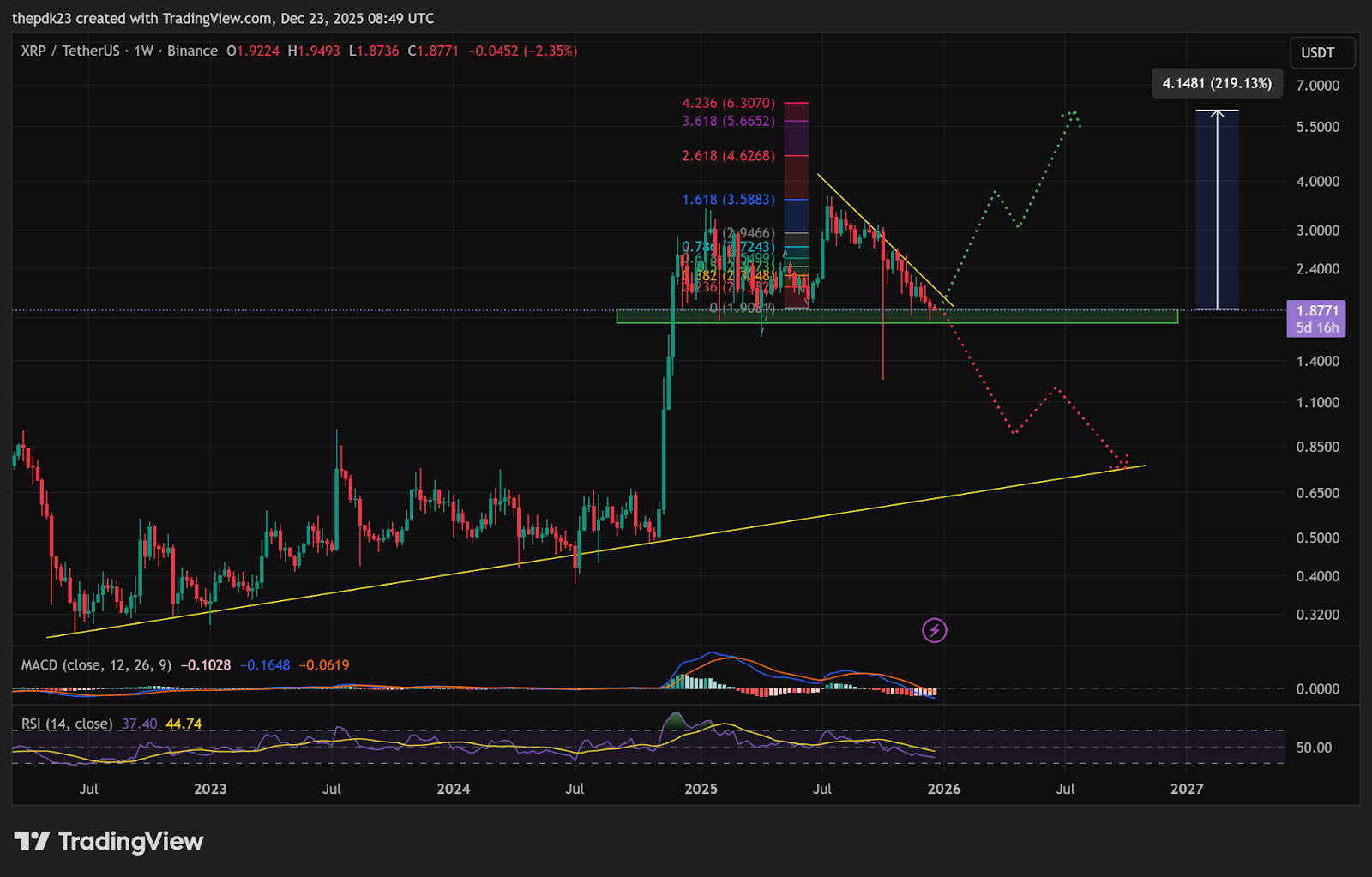 On the weekly chart, XRP trades around $1.88. This level matches a key horizontal support that held after the last major move.