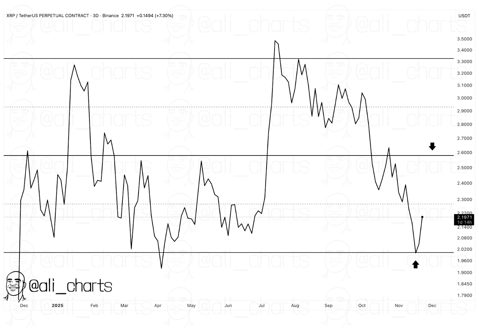 Ali Martinez observed a strong rebound from the channel floor near $1.96, showing firm demand at lower support. The price climbed above $2.14 and began moving toward the mid-channel area. He noted that $2.60 remains the next important level for momentum confirmation.
