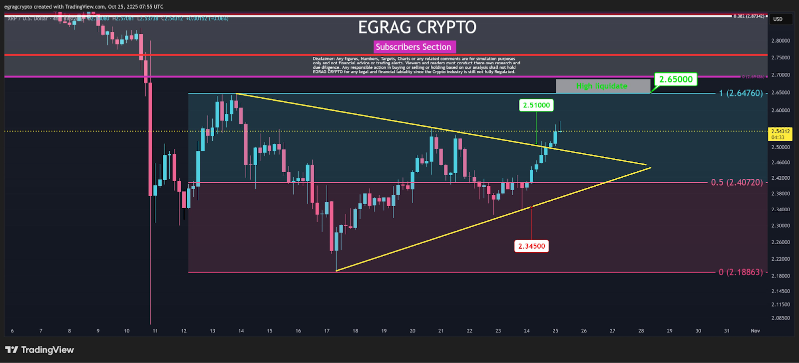 EGRAG highlighted $2.3450 as a key support level, with short-term resistance targets at $2.5100 and $2.6500. These points come from Fibonacci retracement and extension levels, tools often used to track price direction after a breakout.