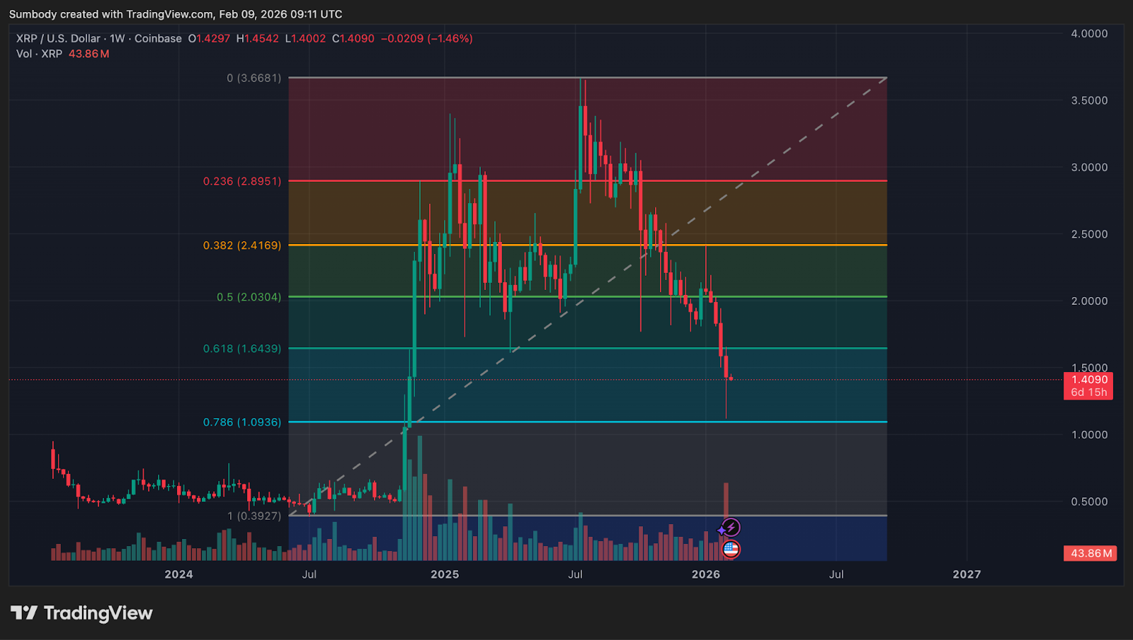 According to data from TradingView, XRP traded for $1.407 at the time of writing, reflecting a 61% decline from its all-time high of $3.666. Meanwhile, the cryptocurrency fell below this level last week, dropping to $1.118, representing a $70% maximum drawdown since achieving its latest all-time high.