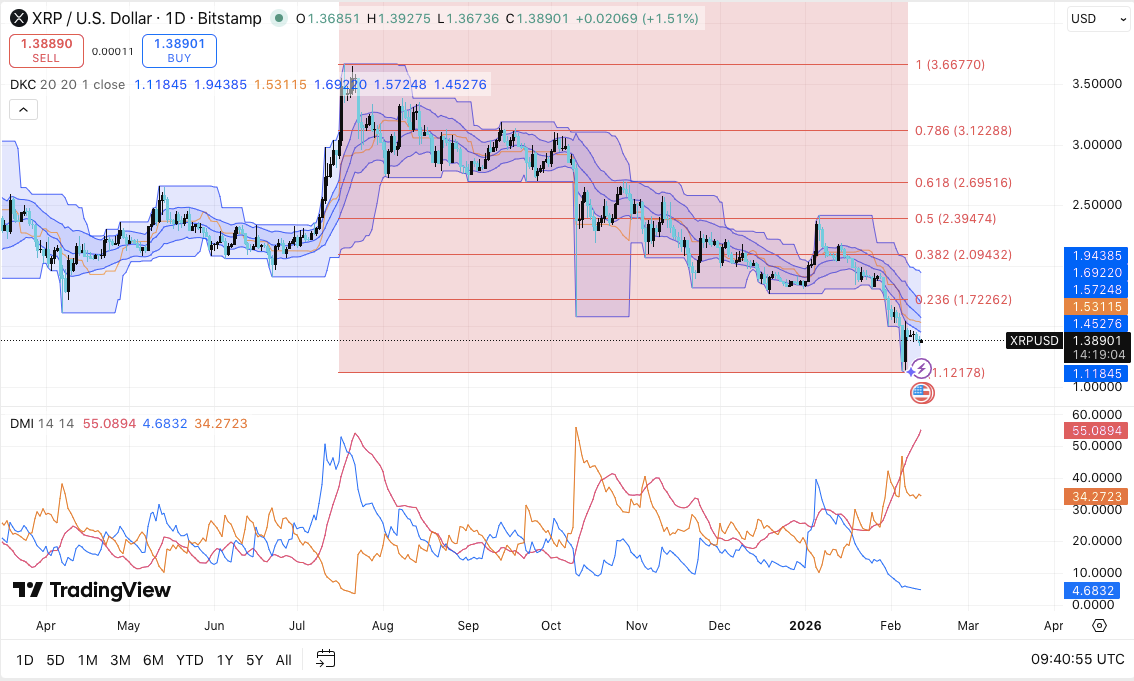 XRP extended its broader decline after failing near the $3.60 to $3.70 cycle top, and the daily chart still reflects a clear bearish structure. The token now trades near $1.38 after rebounding from $1.12, which marks the latest liquidity sweep.