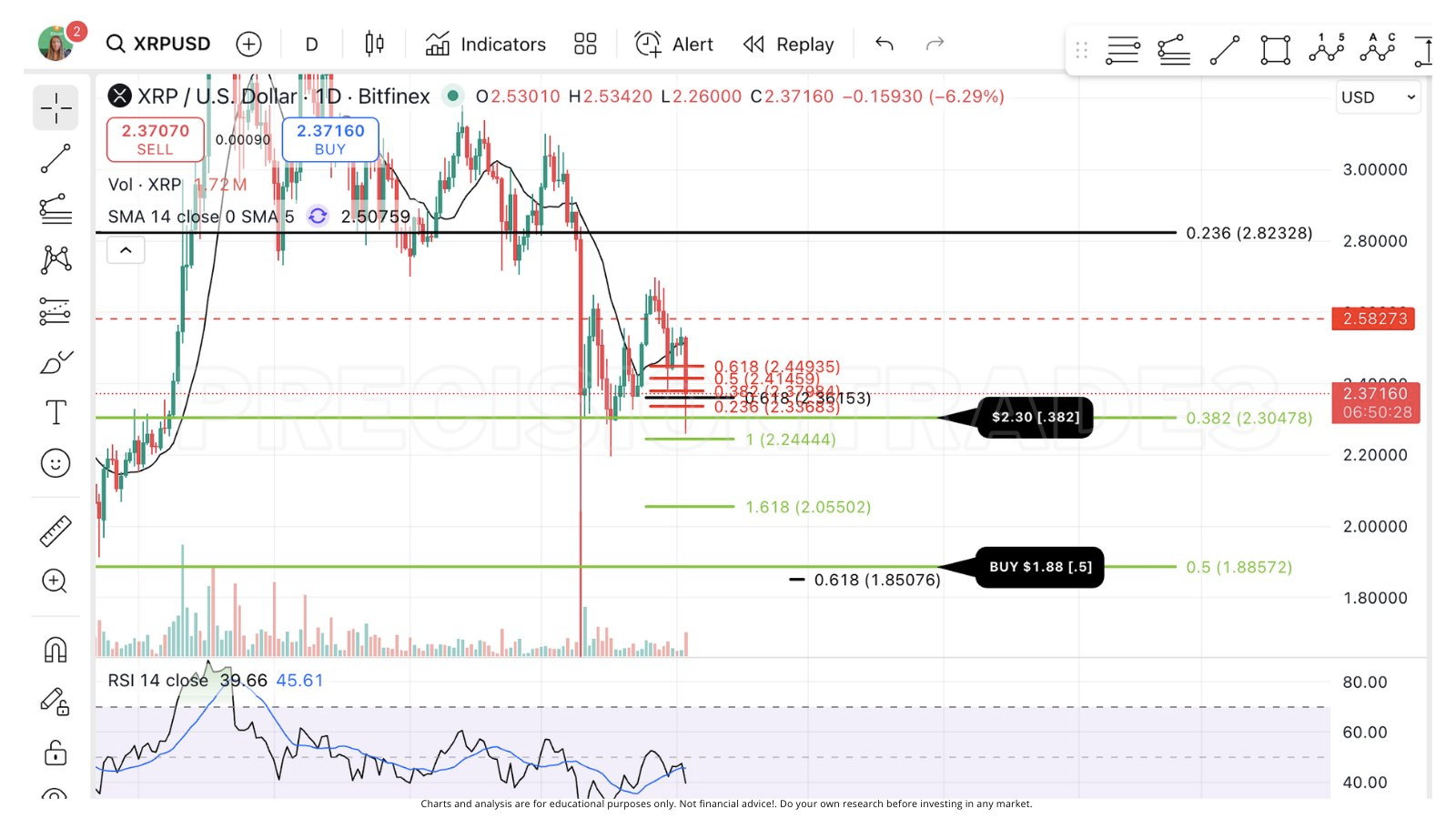 PrecisionTrade3 added that XRP recently tested and bounced from the .382 Fibonacci level at $2.30, suggesting interim support. The next retracement target lies near $2.41 if Bitcoin climbs to $107,400.