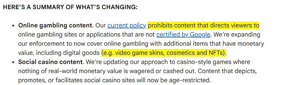 - YouTube expands gambling restrictions to cover video game skins and NFTs.