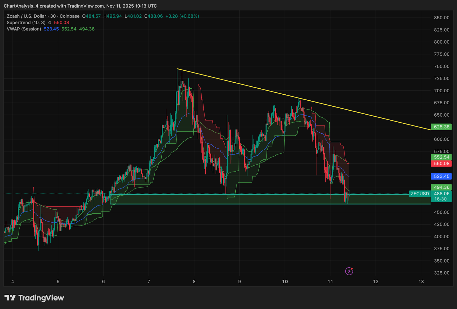 Shorter timeframes show the other side of the battle. On the 30 minute chart, ZEC remains below a descending trendline that has rejected every attempt to rebound from the $630 to $650 zone. Each bounce forms lower highs, and Supertrend on the same timeframe is still red. VWAP sits above current price near $523–$552, creating a magnet level for intraday liquidity.