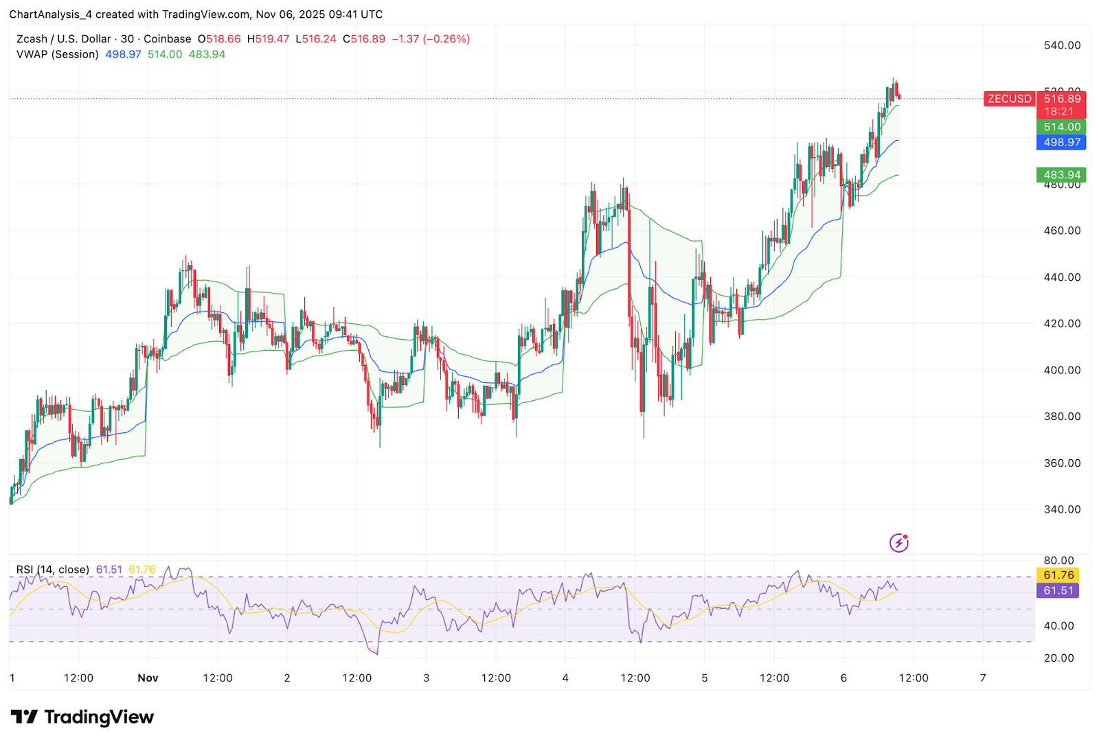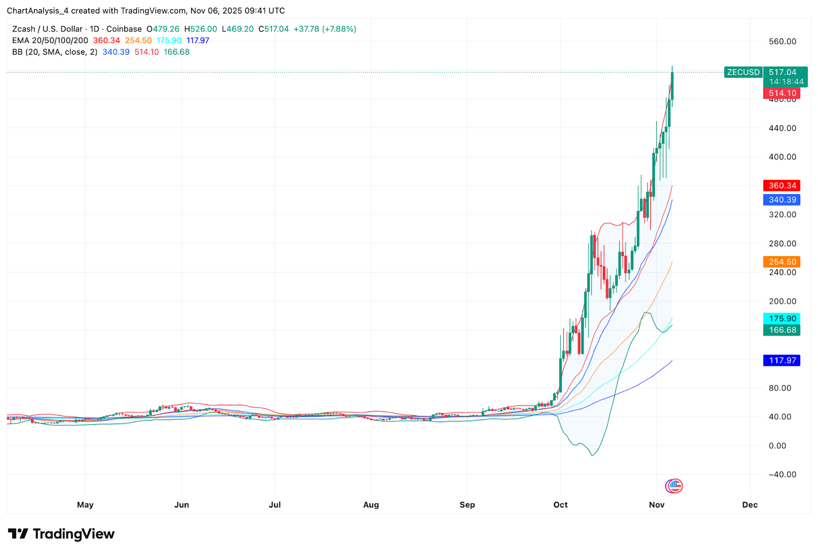 Zcash price today trades near $517 after breaking above the psychological $500 level for the first time since 2018. The surge follows a 900 percent rally since early September and marks one of the strongest moves among large cap tokens this quarter. The current surge places buyers under pressure to defend elevated levels as the market tests whether momentum can extend toward the $550 to $600 region.