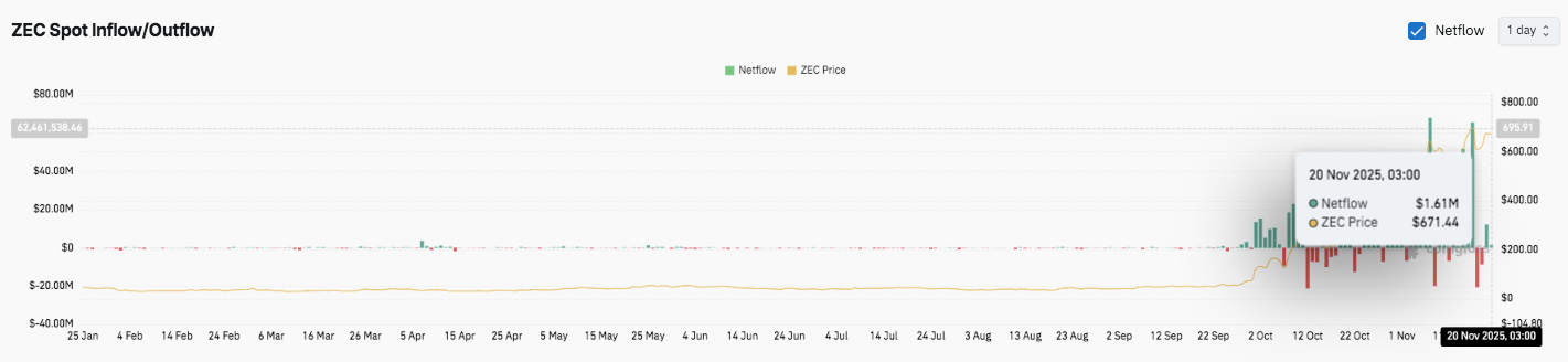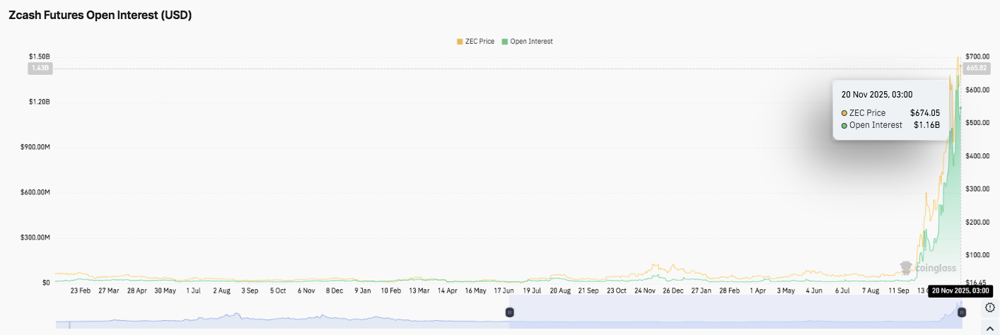 Open interest in ZEC futures climbed sharply in November. It rose toward $1.16 billion by November 20 as traders increased exposure. This rise coincided with ZEC’s surge toward the $670 region. Hence, leverage appears elevated across the board, signaling stronger conviction and greater volatility risk.