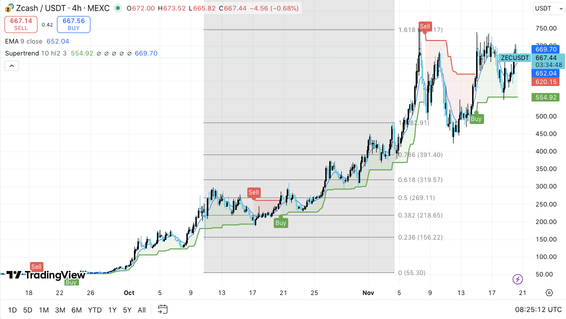 Immediate resistance remains at $683 to $690, creating an area traders monitor for continuation. A sustained move above that zone may clear the path toward the $717 extension. Consequently, ZEC could test new cycle levels if buyers defend current support levels.