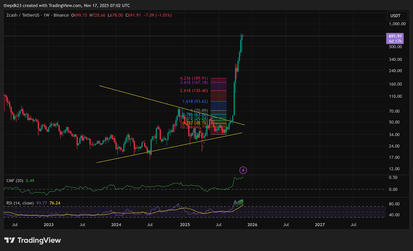 The ZEC weekly chart shows a clean breakout from a multi‑year falling wedge followed by a vertical rally. After clearing resistance at $70, $130, and $190, key Fibonacci extension levels, the price smashed through the 1.618 Fib at $93 and extended far beyond the 4.236 level near $190.
