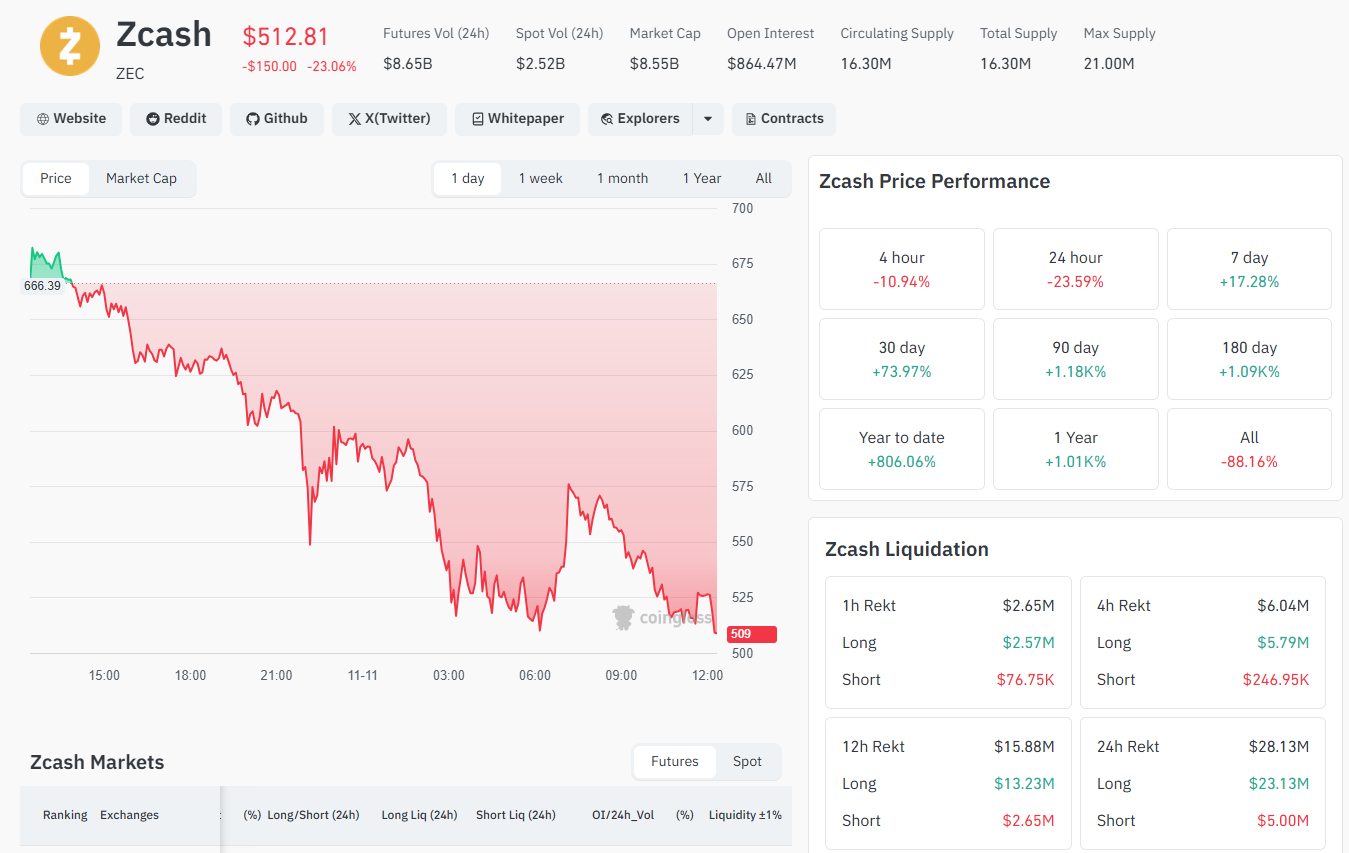 Meanwhile, market data analysis from CoinGlass shows a total of $28.13 million was liquidated from ZEC’s leveraged traders, with nearly $23 million involving long traders during the past 24 hours. The heavy liquidation of long traders triggered a $100 million drop in ZEC’s Open Interest (OI), thus further easing the altcoin’s mid-term Bullish sentiment.