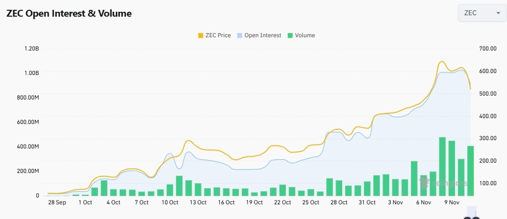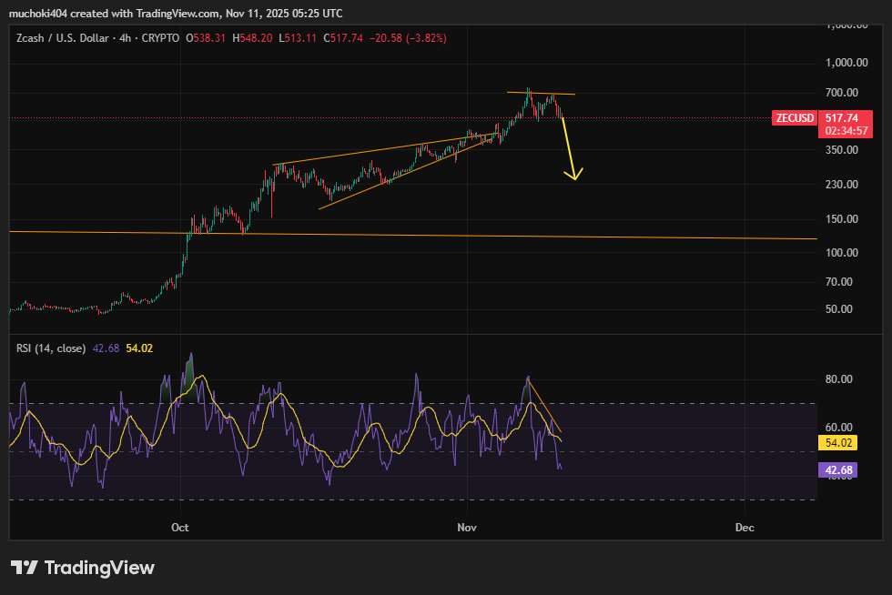 This strong accumulation, however, is running into a potential technical snag. On the daily timeframe, the ZEC price has formed a potential reversal pattern. The mid-cap altcoin, with a fully diluted valuation of about $10.9 billion, recently retested a major supply level around $744.