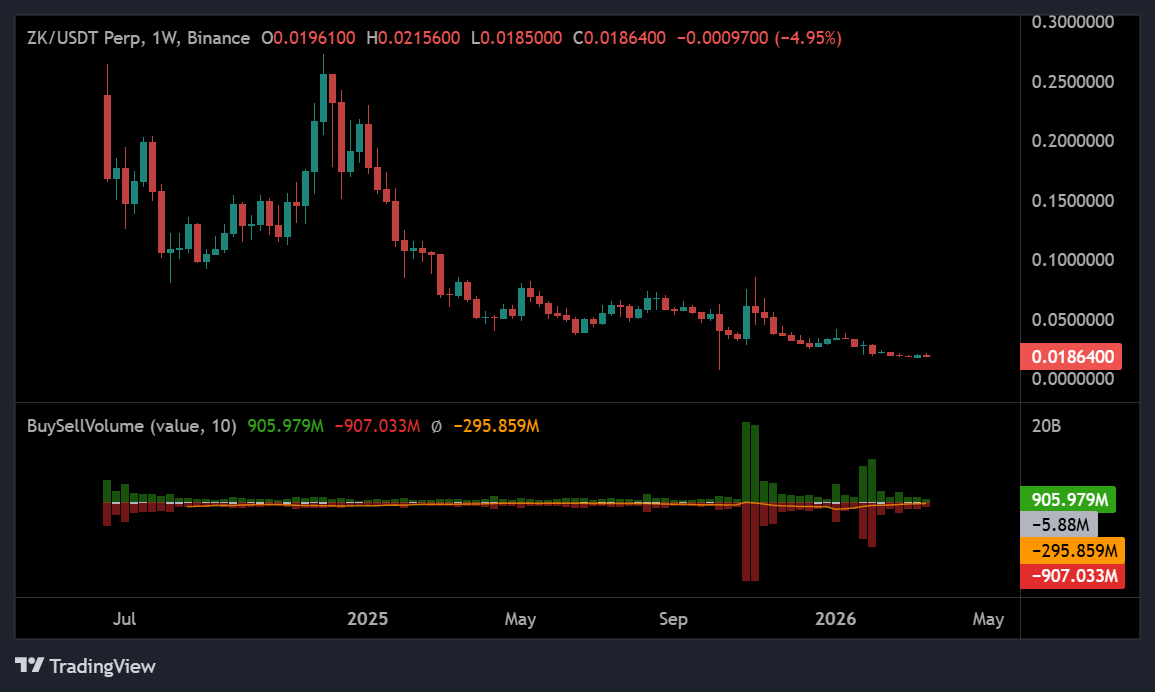 Weekly data from Coinalyze indicates ZK/USDT on a long bearish structure. zkSync traded above $0.20 earlier in the cycle. Since then, the price has steadily declined toward the current $0.018 to $0.019 region.