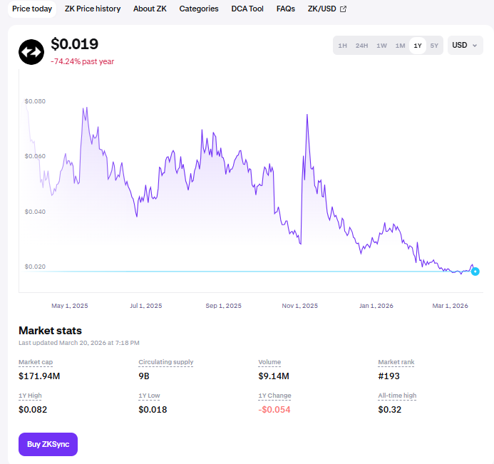 Yearly chart data from Kraken shows that zkSync trades near $0.019 after falling 74.24% over the past year. The data indicate a downward structure that began after the asset reached around $0.07 to $0.08 during mid-2025. Since that period, the token has formed lower highs and lower lows, which signals sustained bearish pressure in the market.