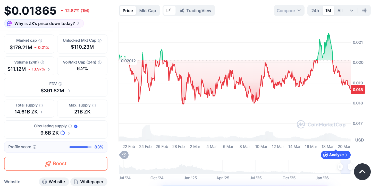 Monthly data from CoinMarketCap indicates zkSync price trading around $0.01865 after a 12.87% drop over the past month. Early in the period, price attempted to move above the $0.020 to $0.021 range. That level acted as short-term resistance and rejected the move in mid-March.